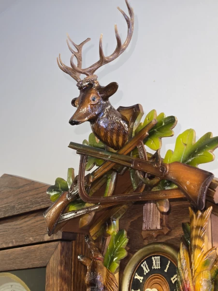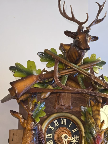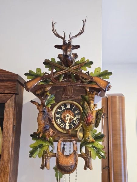 Équipée d’un mouvement mécanique Regula 25, reconnu pour sa fiabilité et sa robustesse, cette horloge offre une sonnerie claire et rythmée, fidèle à la tradition des véritables coucous allemands. Le mécanisme a été soigneusement vérifié et ajusté afin d’assurer un fonctionnement précis et durable.