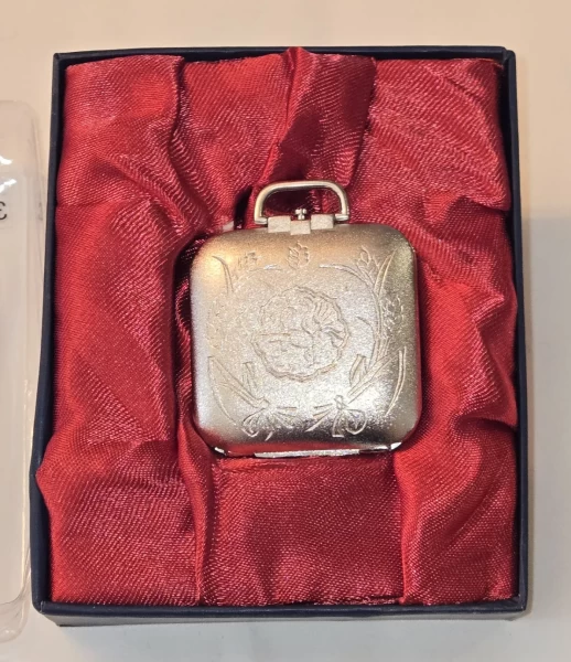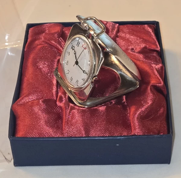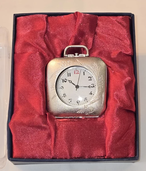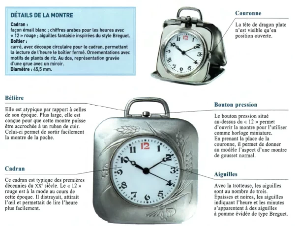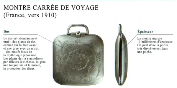 de forme carrée se tenant debout pour servir, au cours d'un voyage, d'horloge miniature. Côté style :