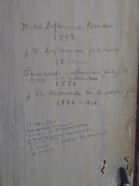 Bien que son fabricant demeure inconnu, cette horloge se distingue par un élément exceptionnel : son histoire familiale complète, manuscrite à l’intérieur du boîtier, soigneusement transmise de génération en génération.