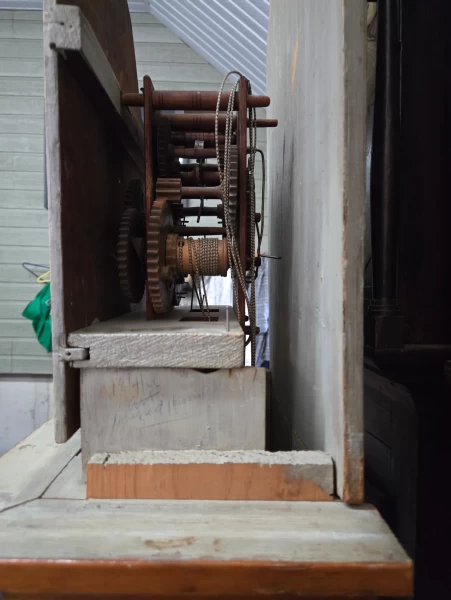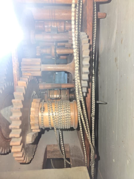 Le mécanisme en bois — aujourd’hui rarissime — témoigne d’un savoir-faire préindustriel. Construit selon les techniques artisanales de l’époque, il combine ingénierie ingénieuse et matériaux naturels.